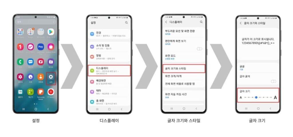 [설정] → [디스플레이] → [글꼴 크기]에서 글씨를 더 크게 할 수 있습니다.